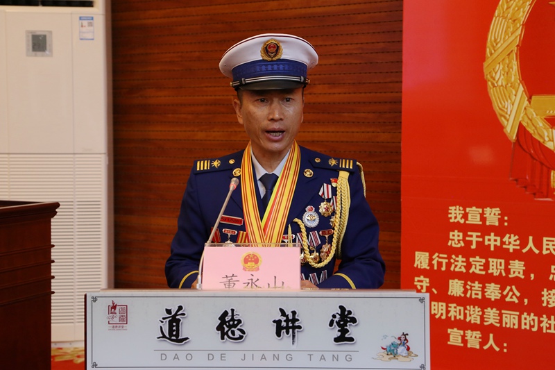 本期道德讲堂共分“唱道德歌曲、读道德经典、学道德模范、谈心灵感悟、送平安吉祥”五个环节。活动在一首《好人就在身边》的合唱中拉开序幕。随后主持人带领大家共同诵读了《中庸》等经典著作,让大家领略了其中深刻的思想内涵。在“学道德模范”环节中,大家共同观看了此次道德模范的主人公——全国优秀共产党员、全国道德模范、曲靖市消防救援支队一级消防长董永山同志的先进事迹短片。随后,董永山同志用质朴的语言和真挚的情感,通过亲身经历的四个生与死的故事,从不同层面、不同角度,声情并茂地讲述了助人为乐、扶危济困、无私奉献、爱岗敬业的先进事迹。